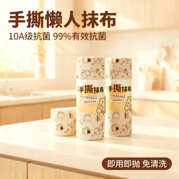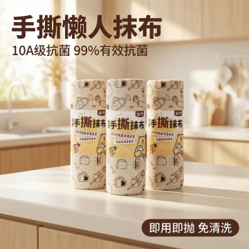 [文字版式] 左上角主标题“懒人去污抹布”加粗深色大字体,副标题“厨房油渍轻松搞定”浅色小字体;右下角五个胶囊标签分别标注“加大加厚”“干湿两用”“食品级”“无荧光剂”“不易掉毛”,深色字浅色半透明底,排版整齐错落