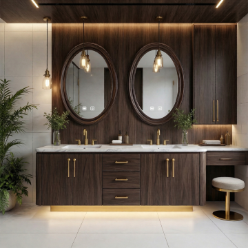 极简主义风格的卫生间室内设计,整体采用米白色与浅木色的柔和配色方案,温暖的嵌入式灯带与顶部筒灯提供均匀柔和的照明,营造明亮通透的氛围。墙面和地面铺设大块浅色哑光瓷砖,线条简洁流畅。不同场景下的卫生间摆设:有的配备悬挂式白色洗手台,台面整洁,搭配简约白色水龙头,上方是带储物功能的镜柜,旁边装有黑色金属毛巾架;有的设置独立玻璃淋浴房,内部有壁龛收纳洗浴用品,黑色淋浴喷头与五金件形成精致对比;有的墙面悬挂线条简约的黑白花卉装饰画,下方嵌入木质灯带壁龛,摆放香薰和装饰摆件;有的空间内放置智能马桶,旁边设有带木质搁板的收纳区。整体设计注重功能性与美学的平衡,空间布局合理,细节处理精致,呈现出现代、干净、舒适的卫生间环境。