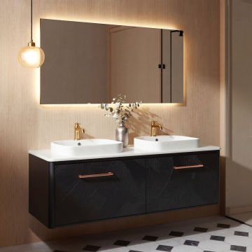 极简主义风格的卫生间室内设计,柔和的米白色与浅灰色调为主,整体明亮通透,自然光透过隐形光源均匀洒入,营造出干净、宁静、高级的氛围。浴室中央是悬挂式米白色洗手台,台面光滑整洁,台上放置简约设计的水龙头和几瓶透明瓶装洗漱用品,台下有隐藏式抽屉和开放式储物格,内置叠放整齐的毛巾与洗漱用品。洗手台上方是带LED灯带的长方形镜面柜,柜内隐约可见折叠整齐的毛巾,镜面清晰映照出浴室景象。右侧是白色壁挂式马桶,线条流畅。左侧为透明玻璃淋浴房,内部有简约的置物架和手持花洒。墙壁采用大块浅色瓷砖铺设,地面是光滑的白色大理石瓷砖,整体空间布局紧凑有序,功能分区明确。金属色毛巾架上挂着白色毛巾,与整体色调和谐统一。设计注重空间的简洁性与功能性,无多余装饰,强调材质本身的质感与光影的细腻变化,呈现出现代、简约、舒适的卫浴空间。