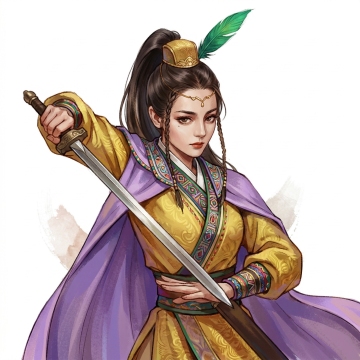 中国风二次元插画,一位手持长剑的年轻女性侠客,采用飘逸灵动的水墨风格线条,柔和的渐变色彩,简约的笔触质感,人物姿态挺拔,眼神坚定,黑色短发点缀粉色发饰,身着变换后的新造型服饰——淡紫色与鹅黄色渐变交叠的改良汉服,上衣为立领琵琶袖,下裙为层叠百褶裙,腰间系着深红色腰带并悬挂玉佩,黑色长靴,背景为纯色浅米色,周围环绕着轻盈的淡紫色云纹和飘落的黄色花瓣,整体画面保持清新雅致的氛围,构图居中平衡,光影柔和,突出人物主体。