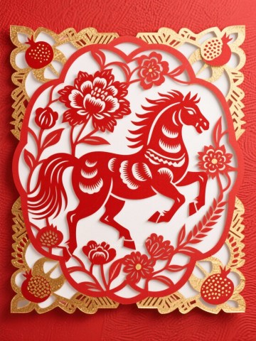 红金双色剪纸风,融合中式吉祥元素,马踏祥云,寓意新春喜庆与国潮风尚。