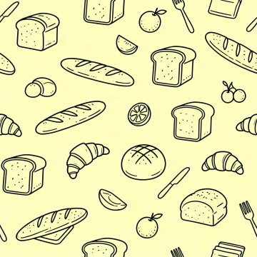 淡黄色背景上,以简约流畅的线条勾勒出多种不同面包纹样,包括切片面包、法棍、牛角包、吐司、圆面包等,搭配少量餐具和水果元素,形成均匀分布、无缝衔接的重复图案,整体风格清新明快,线条简洁连贯,视觉效果统一和谐。