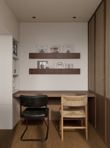 现代感与木雕风融合,光影交错间展现简约主义的舒适与商务质感,性冷淡风中透出质朴温暖。