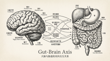 复古风格白描版画,融合浮雕质感与简约线条,呈现脑肠轴双向交互,古典质朴中透出科学之美。