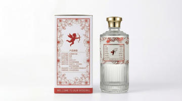新中式风格喜酒瓶和酒盒包装,透明玻璃酒瓶搭配金色瓶盖,带有红色喜字花纹的白色酒盒,参考原图的新中式红白金配色风格,只保留酒瓶和酒盒,保持产品物理结构不变,不扭曲变形,放置在金色金属展示台,背景是暖橙色渐变墙面搭配金色线条装饰,左侧有金色迎客松摆件,整体是国内电商画报风,全屋漫射柔光,低对比度,阴影柔和,画面明亮干净,暖米色低饱和度色调,精致极简室内棚拍场景,严格锁定原图宽高比,4K高清分辨率