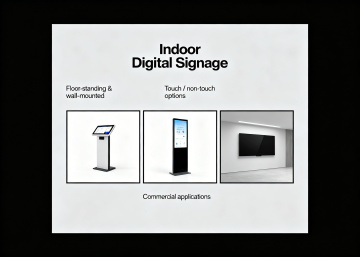 设计户外高亮显示屏产品的产品目录页(catalogue),整体风格现代商务简洁,顶部放置大标题"Outdoor High Brightness Displays",下方列出产品特性:2000–4000 nits亮度、IP65防护等级、支持独立式/壁挂式安装、户外环境性能稳定。页面中合理放置三张产品实景展示图,采用清晰排版,左侧为文字参数,右侧为产品图片,专业商务配色,适合用作外贸产品宣传目录。