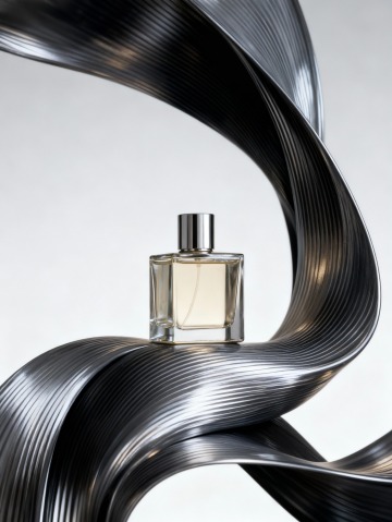现代感玻璃瓶身,几何线条简洁利落,镜面反射增强清透与优雅,柔和粉调背景衬托时尚氛围,简约主义美学尽显高级质感。