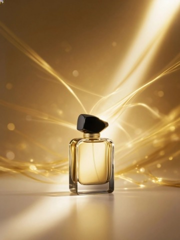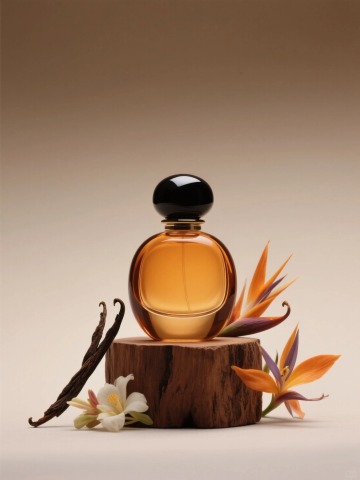 琥珀色香水瓶置于木桩之上,环绕热带花卉与香草,融合奢华感与质朴感,3D风呈现细腻质感,玻璃风透出优雅清新,自然元素烘托静谧氛围。