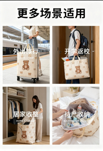 第10屏:旅行分装场景便携实用,严格还原上传产品参考图,精准复刻包装设计、产品配色、LOGO位置及比例、文字内容及字体、图案元素及细节,无任何偏差,色彩无失真;产品与画面中其他物体的比例遵循真实物理空间逻辑,视觉协调,比例还原1:1,杜绝比例失衡、视觉突兀;高级简约风格,莫兰迪灰为主色调,辅助色为米白色、浅蓝色,饱和度30%,明度80%,柔和自然光从画面右侧45°入射,光影清新,营造旅行氛围;主标题"旅行分装·轻便不占地"位于画面上1/3居右,字体为简约无衬线体,字号32px,颜色深灰色,加粗;副标题"收纳衣物·干净卫生"位于主标题下方8px处,居右,字体为简约无衬线体,字号18px,颜色中灰色;画面中下部呈现旅行场景,左侧放置1个打开的行李箱浅灰色,行李箱内整齐摆放2个收纳袋分别装衣物、内衣,右侧放置1个折叠好的收纳袋,体现便携性;行李箱旁边点缀1个简约旅行包浅米色,增强场景感;画面左侧标注文字"轻薄便携·易携带",字体为简约无衬线体,字号16px,颜色中灰色;画面留白35%,背景为米白色,无多余装饰,整体场景简洁、实用,突出产品旅行分装的优势,吸引旅行爱好者,高清300dpi,无模糊、无噪点