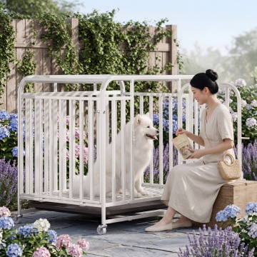 白色不锈钢狗笼,保持物理结构绝对不变,放置在家庭庭院浅灰色石板地面,周围环绕白色与淡粉绣球花、紫色薰衣草,背景是原木栅栏爬满常春藤,整体更清新通透。柔和自然光漫射10:00左右光照,低饱和奶油色调,阴影极淡。三分法微俯视构图,狗笼内坐着成年白色萨摩耶,第二位不同的齐肩黑发美女坐在小藤凳上,手持零食袋逗狗,姿态轻松微笑,清透妆容。超清新庭院氛围1:1比例,4K超清商业摄影,保持狗笼结构清晰完整。