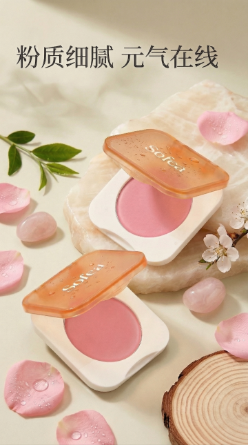 撕纸风拼贴杂志感,柔和粉调腮红轻盈绽放,清透雾面质感呼应时尚美学,营造高级柔美氛围。
