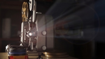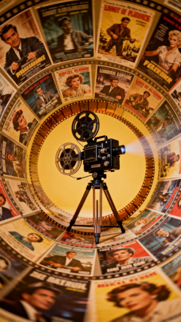 3D渲染风格的电影主题背景,主色调为温暖的棕黄色与金色,柔和的侧上方光源投射出清晰而富有层次感的阴影,高光在金属表面形成细腻的反光。画面中心偏左位置放置一个复古电影胶片卷轴,金属轮盘呈现出精致的齿轮纹理和哑光金属质感,卷轴上缠绕着深棕色的胶片。一条黑色的电影胶片带从卷轴中延伸出来,向右下方自然弯曲,胶片边缘的孔洞和方形胶片格细节清晰可见,胶片带在浅色背景上投下带有胶片格阴影的光影图案。整体构图采用简洁的静物摆拍形式,背景为平滑的浅棕色平面,营造出怀旧、专业且略带神秘感的电影氛围,突出电影工业的经典元素与艺术质感。