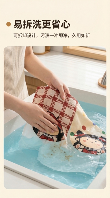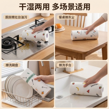 [画面元素] 四宫格上下布局,分别展示:1.厨房擦灶台油污;2.餐桌擦灰尘;3.擦洗碗盘;4.擦洗手台,每个小场景都使用本款懒人抹布,场景自然生活化,整体干净整洁,产品在每个场景都清晰可见