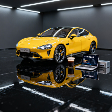 现代感与科技感交织,3D风重拟物设计,金属质感车身包裹银色车衣,荧光绿线条勾勒未来轮廓,光影交错间尽显未来感与实景感。