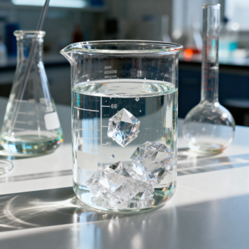 极简构图,高清晰度实验室背景特写,在磨砂玻璃台面上,三支等高的透明玻璃试管呈正三角形排列,每支试管中精确盛有三分之二体积的冰蓝色液体,液体表面漂浮着三枚完美对称的气泡,右侧戴着无粉蓝色丁腈手套的拇指与食指正捏持一支细长的移液管,尖端悬停在中央试管正上方2毫米处,一滴晶莹的透明液滴即将脱离吸管,背景为均质的浅灰色环氧树脂墙面,顶部嵌入式LED灯带形成柔和的漫反射光源,在试管壁上投射出平行的光带,整体色调由冰蓝、雾白与浅灰构成,无任何多余元素,画面呈现出数学般的精确对称感,传达出冷静、纯粹的科学美学。