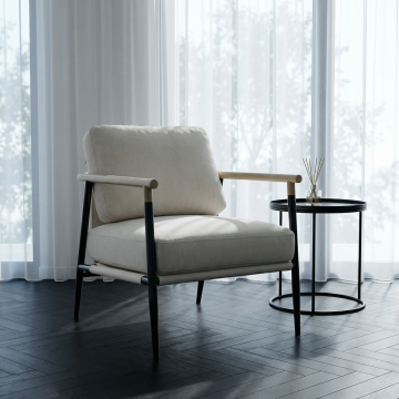 清新自然的木雕风座椅,融合简约主义与性冷淡美学,柔和光线与绿植营造舒适质朴的实景空间感。
