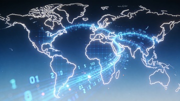 白色背景下的地球半解剖结构线框图形,采用渐变霓虹蓝与紫色线条,呈现未来科技感风格,节点为发光圆点,线条流畅且具有轻微的光晕效果,保持原有的世界地图轮廓和网络连接结构,整体设计简洁现代,突出科技与全球化主题的视觉表现。