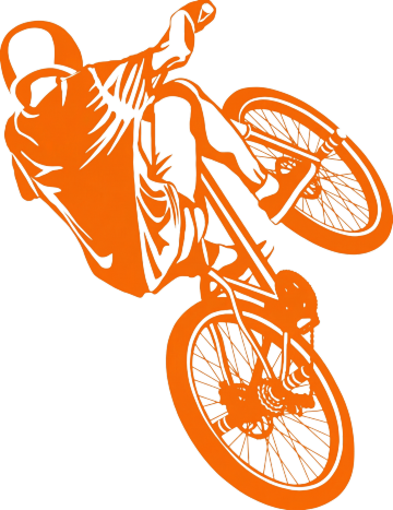 卡通风格插画,一位戴着橙色头盔的男性正在骑红色自行车,他穿着蓝色短袖T恤和黑色短裤,戴着蓝色手套和蓝色运动鞋,身体前倾,双腿蹬踏,自行车车轮为黑色辐条轮,整体画面简洁明快,色彩鲜明,线条流畅,无背景,人物表情略带微笑,姿态充满动感。