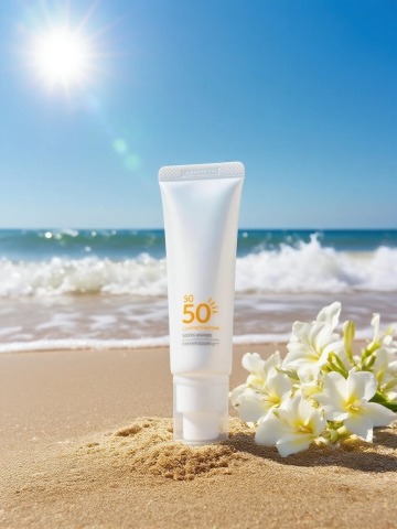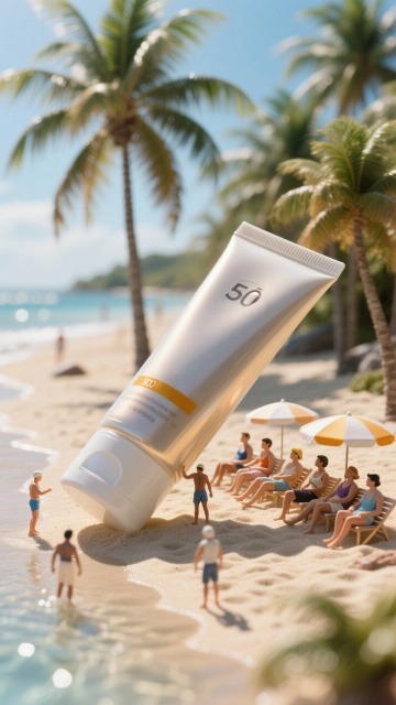 3D微缩艺术风,清新清爽感,防晒霜与沙滩小景,夏日度假氛围。