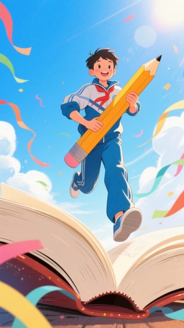 插画风超现实主义,清新励志热血,师生共跑赛道,梦想齐飞。