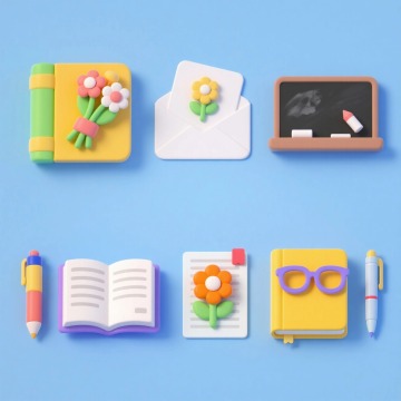 白色背景上排列整齐的6个不同配色、不同样式、不同材质的教育元素,采用现代简约的2.5D等距立体风格,每个元素具有平滑的渐变色彩过渡,柔和的光影效果,轻微的阴影增加立体感,元素包括书本、铅笔、地球仪、计算器、放大镜和毕业帽,每个元素细节丰富,边缘圆润,色彩明快且对比鲜明,整体构图平衡,具有清晰的视觉层级和简洁的设计感。
