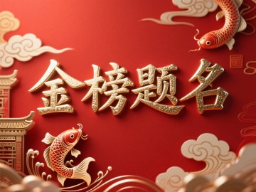 “金榜题名”在一排,四字采用青铜浮雕纹理质感,背景为喜庆红色,有云纹、锦鲤,象征鲤鱼跃龙门,正面主视角,中国风,4K高清,大气好看,背景有些小马