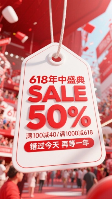 喜庆促销氛围,卡通人物互动,618购物节主题。