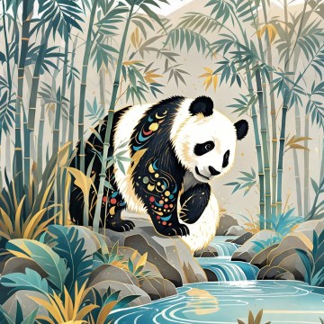 水彩风与厚涂技法结合,描绘竹林中静坐的熊猫,清新柔和,充满自然舒适感,插画风格细腻生动。