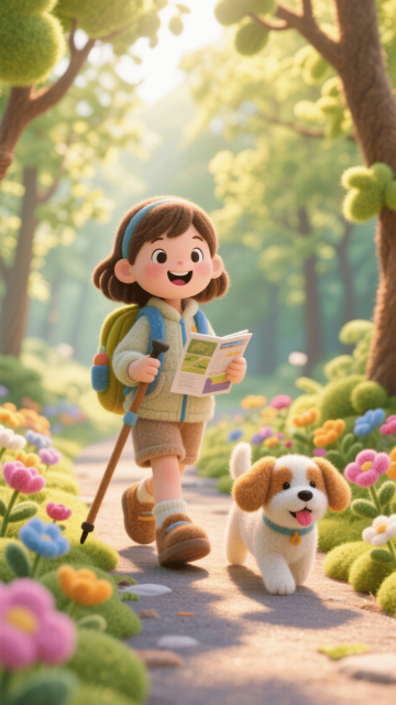 软3D风卡通场景,拟人化小女孩与萌犬共游花林,清新梦幻,趣味温馨,虚拟自然之美跃然眼前。