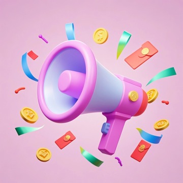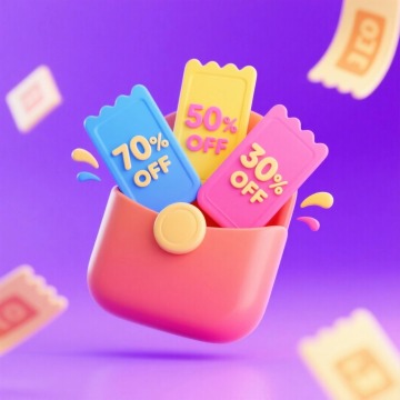 软3D风格,塑料质感的紫色信封中飞出多彩折扣券,充满促销感,色彩明亮活泼,节日氛围浓厚。