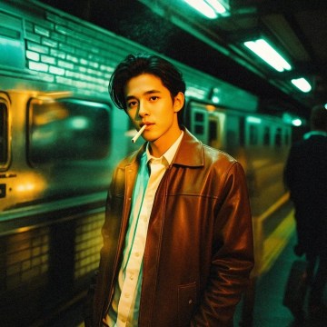 地铁内,city pop风的时尚潮流感,霓虹色调营造现代都市氛围。