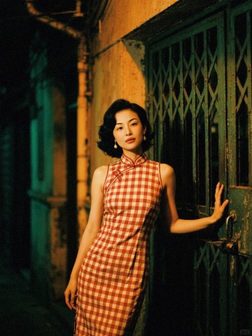 复古胶片风与国潮元素融合,红白格纹旗袍勾勒优雅身姿,金属门扉映衬光影交错,营造出浓郁中式文艺氛围。