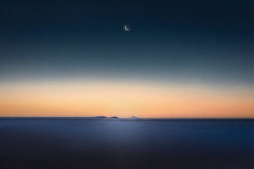 极简主义风格的海上日落,画面由水平线条分割为广阔的天空与平静的海面,天空从顶部的浅橙色渐变至地平线的温暖橙红色,巨大的圆形太阳低悬于海平面中央,散发柔和而明亮的光芒,水面波光粼粼,呈现出橙色与蓝色交织的横向波纹,整体色调统一和谐,光影过渡自然柔和,营造出宁静、开阔、温暖的氛围,画面简洁干净,没有多余元素干扰主体视觉。