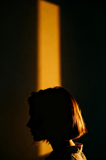 剪影风双色设计,海边女子静谧独立,波浪轻拍,黑白对比营造宁静氛围。