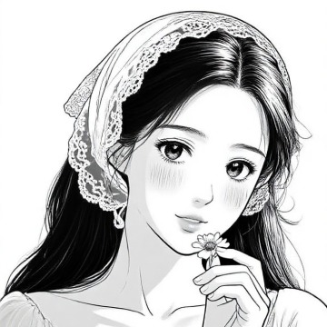 古典优雅的白描风漫画,少女手持花束,文艺气息浓厚。