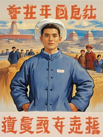 插画风融合工笔与厚涂技法,质朴中见工业感,展现移民建设新村的励志故事。背景山水辽阔,人物群像生动,传递时代变迁的温情与力量。