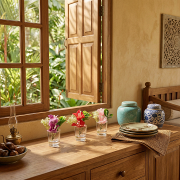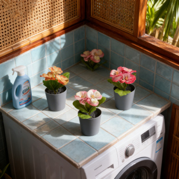 柔和光影下的现代简约风格室内场景,以清新的蓝绿色调为主,木质桌面上摆放着白色小花瓶,里面插着黄色花朵,背景是带有白色窗框的窗户,窗台上整齐排列着白色陶瓷罐和厨房用具,整体氛围宁静舒适,空间明亮通透,细节清晰,具有生活气息的温馨家居环境。