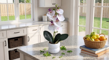 极简主义风格的厨房台面特写,柔和的蓝灰色调,木质纹理的浅色桌面,前景摆放着一个白色小花盆,里面插着一朵鲜艳的黄色花朵,背景是干净的白色橱柜和带有磨砂质感的窗户,窗台上整齐排列着白色陶瓷罐和装有黄色小花的花瓶,整体画面呈现出宁静、整洁、现代的北欧氛围,光线柔和,阴影细腻,色调统一和谐,营造出舒适放松的居家环境。