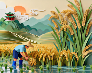 水彩风插画,融合田园与轻拟物元素,以柔和色调呈现稻田丰收景象,木勺盛满白米,呼应自然质朴之美,传递清新宁静的秋日气息。
