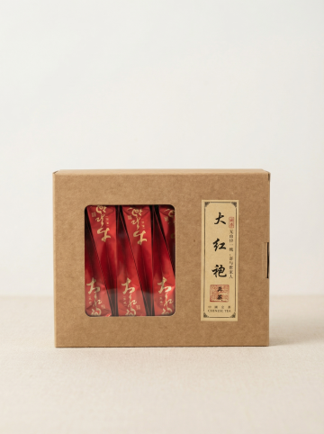 [主图 1 首图场景展示] 大红袍茶叶牛皮纸包装盒产品展示首图,简约干净风格,主体为原产品包装盒,产品外观和原图保持100%一致,包装盒居中放置在纯色浅原木桌面上,背景为干净浅米白色墙面,自然柔和漫射光影,整体简约高级。左文右图排版,左侧悬浮文案主标题"大红袍"大字,副标题"岩骨花香 香气馥郁",右侧放置产品主体。配色为红棕色+米白色,字体采用简约宋体,深棕色字。产品主体占画面约60%,构图均衡,留白充足,1:1构图,2k分辨率,严禁出现正岩、母树、产地直发等违禁词。