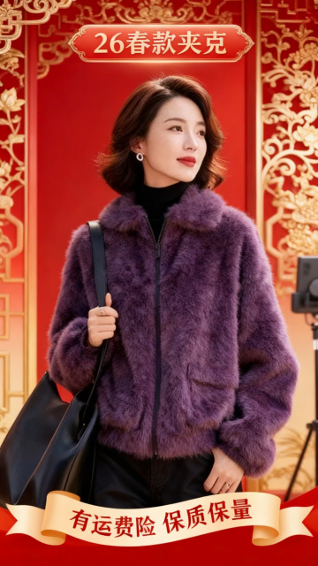 国潮风融合重拟物设计,紫绒夹克尽显奢华质感,中式红金背景烘托喜庆氛围,面料纹理细腻,时尚与传统交融。