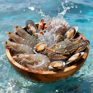 从俯视45度角视角拍摄的多种新鲜海鲜组合,包括帝王蟹、龙虾、三文鱼排、贝类和明虾,海鲜色彩鲜亮饱满,细节纹理清晰可见,保持高分辨率商业摄影质感,浅米色简约背景,柔和自然光从左上方45度角照射,形成自然阴影和高光,突出海鲜的新鲜度和质感,画面构图均衡,主体清晰突出,无任何文字和装饰元素。