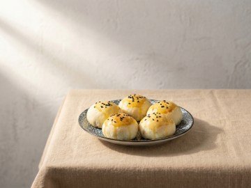 保持五个蛋挞与深灰盘、香草装饰的物理结构绝对不变,严禁变形。更换为温馨美食背景:置于浅橡木桌面,背景为奶油色亚麻布帘,柔和侧逆光营造温暖氛围,低饱和莫兰迪色调,画面干净通透,商业种草风,4K高清。