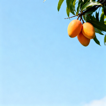 简约现代风格的芒果元素图案,纯色背景,无任何文字和水印。画面中展示完整的芒果果实,表皮呈现鲜亮的橙黄色,带有自然的果点纹理,顶部带有短小的棕色果柄,表面有少量晶莹的水珠质感。整体造型规整排布,构图简洁大方,色彩明快清新,视觉层级清晰,信息传达高效。