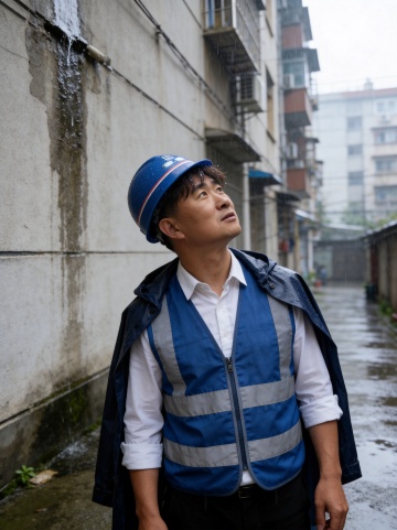 实景感与工业风交融,厚涂肌理呈现干油墨与印刷质感,粗野主义风格凸显质朴力量,工人指向墙面“一底两面”,展现施工细节与艺术张力。