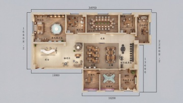 3D微缩艺术风格办公室平面图,融合木雕质感与简约主义设计,呈现商务感十足的现代空间布局。