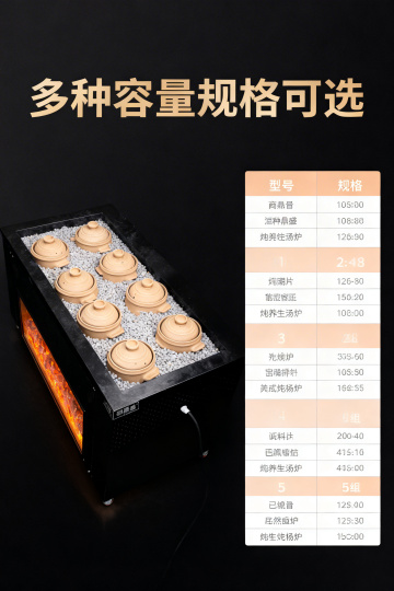 商用养生炖汤炉规格参数详情图,风格简介大气高端,深色雅黑背景,右上角放烤红薯实拍图,左下角放完整型号规格参数表格,展示全部型号信息,表格清晰工整,保留原有表格的浅橙白配色,文字清晰可辨,排版平衡简洁,主标题为“全规格参数对照表”,加粗无衬线浅金色字体放在顶部,整体为2:3比例,符合抖音详情图展示要求