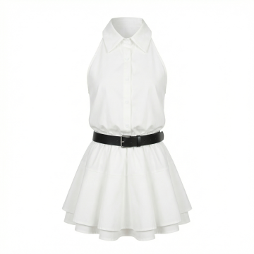 简约主义风格,白衬衫式连衣裙搭配黑色腰带,双色设计风凸显优雅与时尚感,清新不失商务气质。