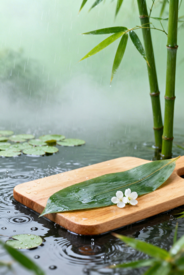 晨雾弥漫的竹林深处,一束金色的阳光如舞台追光般穿透薄雾,照亮一株斜逸而出的翠竹,竹节上凝结的露珠在光线中闪烁如碎钻,几片新抽的嫩绿竹叶低垂着触碰水面,激起一圈圈涟漪,倒影与实景在静谧的水面交织成迷离的双重世界,远处竹林层层叠叠融入朦胧的青灰色雾霭,空气中漂浮着细密的光尘,色调是清冽的翡翠绿与晨雾的柔白交织,营造出空灵而湿润的东方意境。