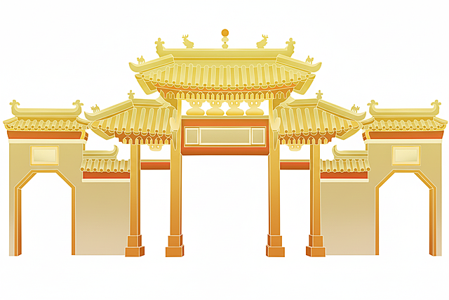 修改图片,将房梁颜色调整为蓝绿色,加深门窗和柱子的颜色,保持矢量卡通插图风格,对称古典建筑,红色结构金色屋顶不变详情